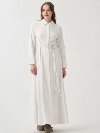 احصلي على مظهر أنيق مع فستان أبيض بتفاصيل حزام، مصمم خصيصاً للواتي يبحثن عن الأناقة في التفاصيل. مثالي للطقوس اليومية