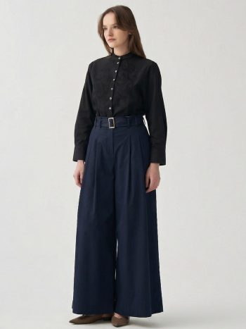 بنطلون واسع الأرجل بلون أزرق داكن مع حزام وطيات
