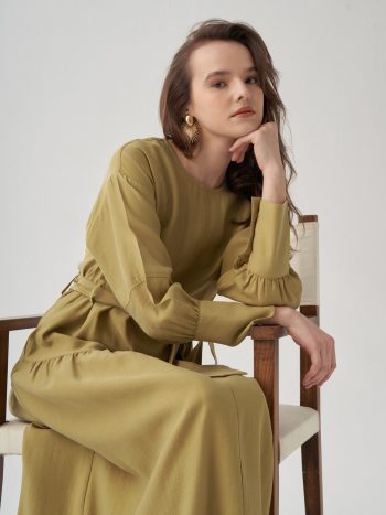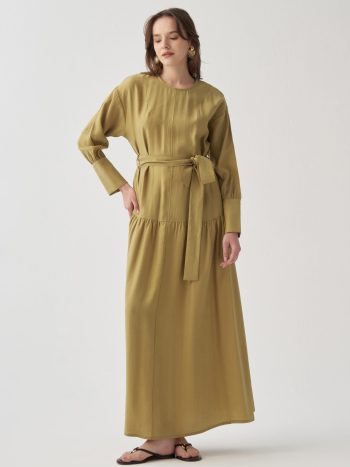 فستان أخضر ناعم بتفاصيل مطويّة
