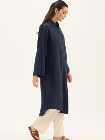 يقدم هذا التونيك الطويل الأزرق النيلي مظهراً طبيعياً ومنعشاً، مما يجعله أحد القطع الخفيفة والأنيقة لموسم الصيف. مصنوع من مزيج 88% تنسل و12% بولي إستر، يوفر نسيجه راحة طوال اليوم بفضل ملمسه الناعم وتركيبته القابلة للتنفس. التصميم البسيط، تفصيل الأزرار المخفية، والحاشية المنحنية الأنيقة عند التنورة تخلق هيئة عصرية.