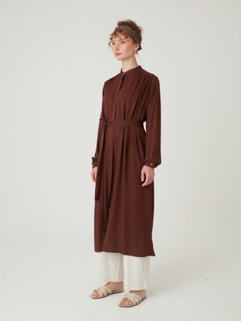 تونيك طويل الأكمام مطوي بلون القهوة المر