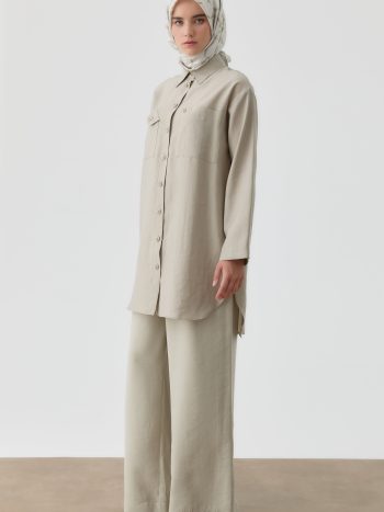 مميزات بدلة البنطال المريحة بلون الحجر بتفاصيل الخياطة: ياقة قميص، أزرار أمامية، تفاصيل جيوب، تصميم أكمام إسبانية، حزام من نفس