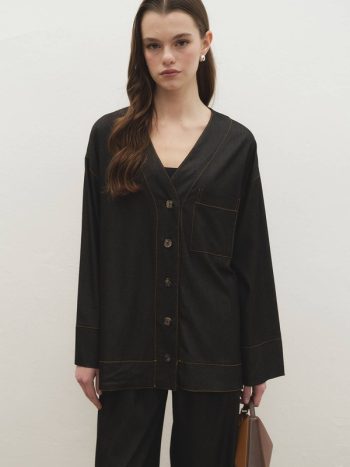 مميزات طقم الجينز الأسود من ميياكي تينسيل طقم بنطال بتفاصيل خياطة على شكل V، خياطة نقطية، إغلاق بأزرار، شقوق جانبية،