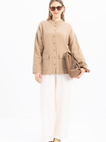 مميزات طقم البنطلون مع الكنزة المحبوكة من البوبلين الكنزة تتميز بتفاصيل محبوكة من البوبلين، إغلاق بأزرار أمامية، تفاصيل في أكمام