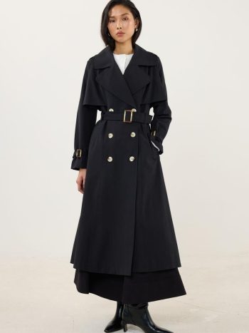 معطف ترينش كلاسيكي طويل مزود بحزام ومشبك باللون الأسود
