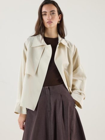 معطف ترينش قصير كريمي بحزام وجيوب