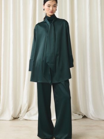 طقم ساتان بنقاط صغيرة مع ياقة مربوطة – الزمردي