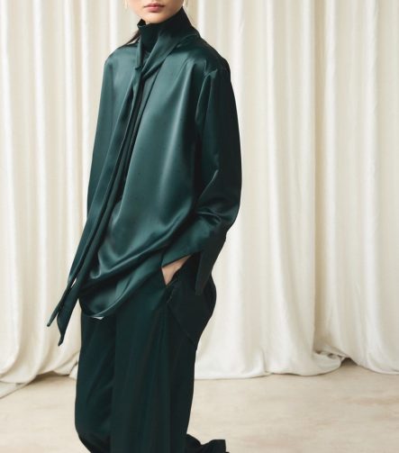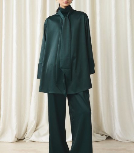 طقم ساتان بنقاط صغيرة مع ياقة مربوطة – الزمردي