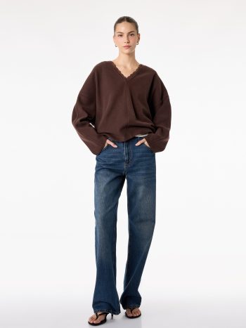 سويتشيرت طويلة الأكمام برقبة على شكل حرف V مع تفاصيل من الدانتيل