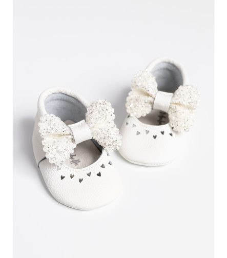 حذاء موكاسين جلد أبيض مزين بالخرز والشرائط للفتيات الرضيعات