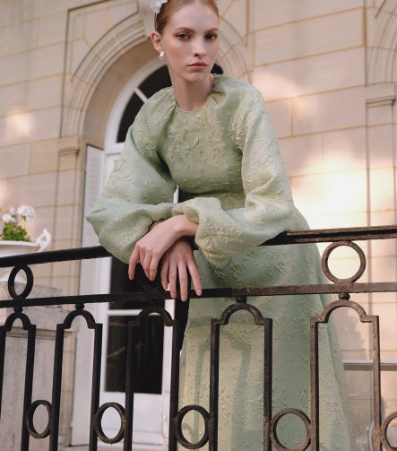 فستان سهرة من الأورجانزا المطرز باللون الأخضر النعناعي