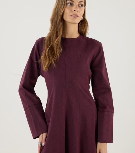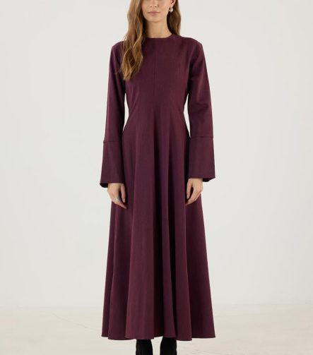 فستان بورجوندي واسع الأطراف مع أكمام واسعة