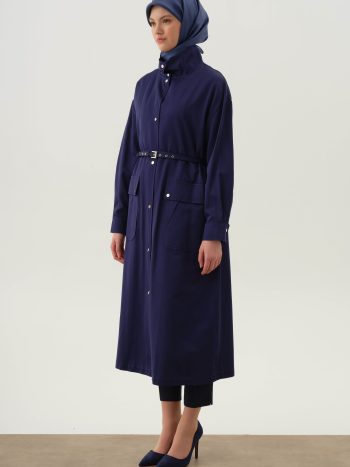 معطف ترينش أزرق بحري بسُحّاب عظمي