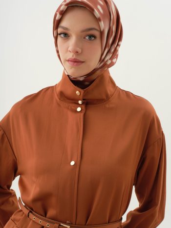 معطف بحزام بلون القرفة وياقة مستقيمة