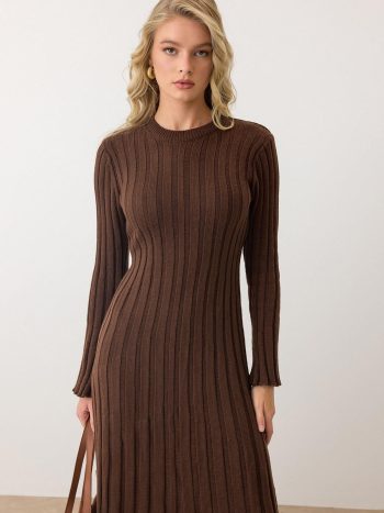 فستان طويل محبوك سميك بقبة الدراجة بلون القهوة 9363-E