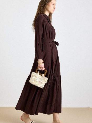 فستان قهوة 9441-E بقماش ناعم وتفاصيل مضلعة وتنورة متموجة