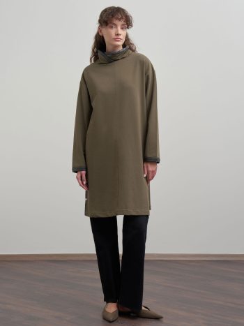 Khaki Leather Trimmed Cotton Long Tunic