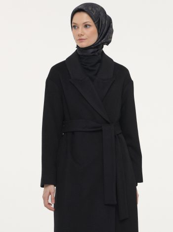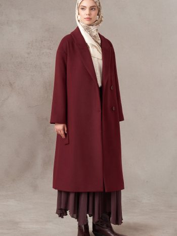 This coat, with its wool-blend texture, offers a warm and soft feel, while the waist belt elegantly accentuates the silhouette.