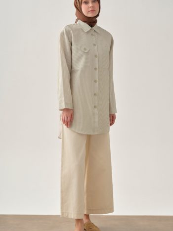 Bel kısmındaki zarif pileler, hareketli bir görünüm kazandırırken; dökümlü yapısı sayesinde gün boyu konfor ve stil bir arada sunuluyor. —