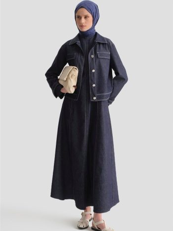 This set merges modern denim texture with an elegant silhouette, adding refined character to urban style. The dress features accent