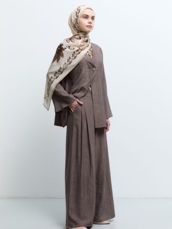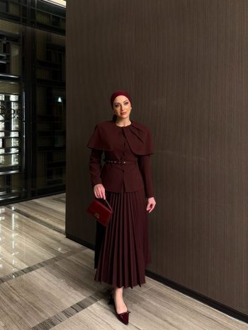 *Jacket features a shoulder cape detail *Full-length buttoned jacket with belt detail *Skirt has elastic waistband *Skirt features pleated design