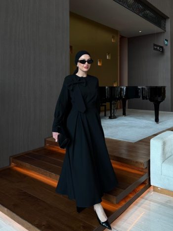 The dress is made of polyviscose fabric. The dress features a bow detail on the shoulder. The dress has a