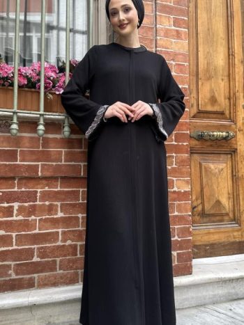 Elegant and sophisticated abaya featuring exquisite stone embellishments, designed for modest fashion with a touch of luxury.