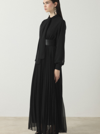 A sophisticated black chiffon dress featuring an elegant skirt design. Perfect for special occasions and evening events.