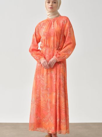 This patterned chiffon dress elegantly accentuates your waist with its knit belt detail, bringing sophistication to the forefront with its