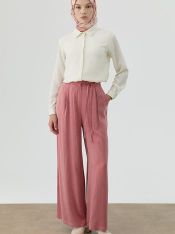 Anvelop kesimiyle katmanlı bir görünüm sunan bu pantolon, pile detayları sayesinde hareketli ve akıcı bir siluet oluşturur. Kumaş İçeriği: %100