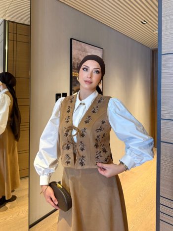 This skirt suit is made of first-class suede fabric. The vest features detailed embroidery work and a front tie closure.