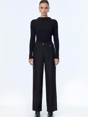 Our black wide-leg pants with accessory detail P-0260 feature an elegant design that combines modern style with sophisticated charm. The