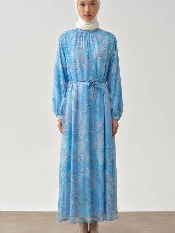 Patterned Chiffon Dress with Knit Belt – Blue