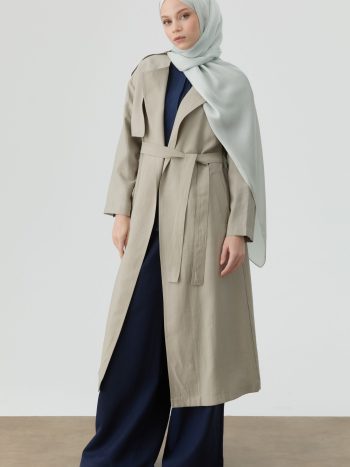 Kemerli ve apoletli tasarımıyla şıklığı ve zarafeti bir arada sunan bu trençkot, modern ve sofistike bir görünüm sağlar. Kemer detayı,