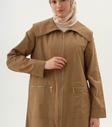 Embroidered and Pearl-Detailed Trench Coat – Camel