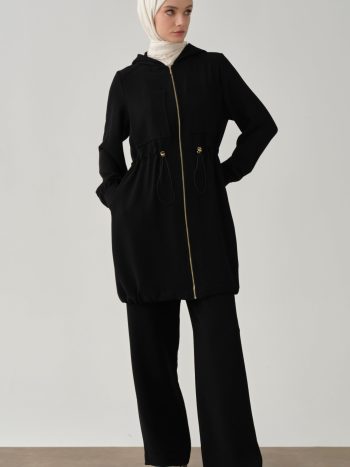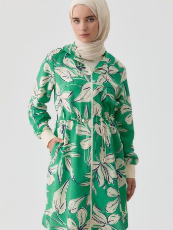This cape gains a feminine flair with its floral patterns, offering a sporty touch with its hood detail. Its comfortable