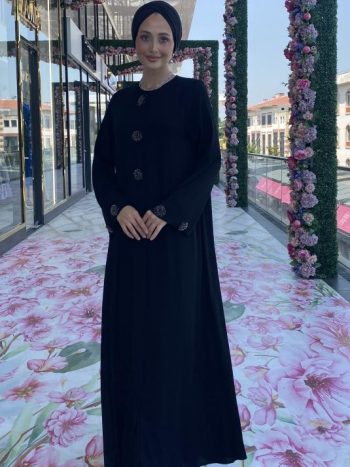Elegant and sophisticated abaya featuring exquisite stone embellishments, designed for modest fashion with a touch of luxury.