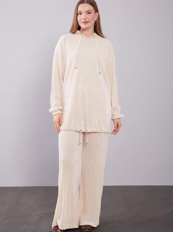 Beige Hooded Two-Piece Set with Drawstring Detail