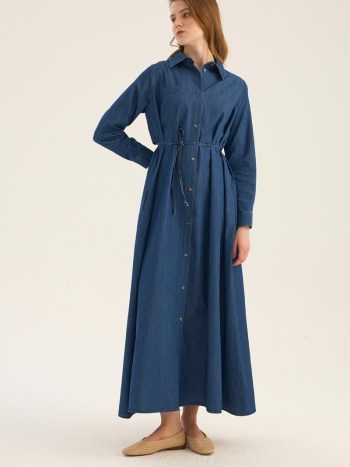 Ürün Açıklaması: Modern ve feminen tasarımıyla öne çıkan bu denim jile elbise, vücut proporsiyonunu dengeleyen formu sayesinde daha ince bir