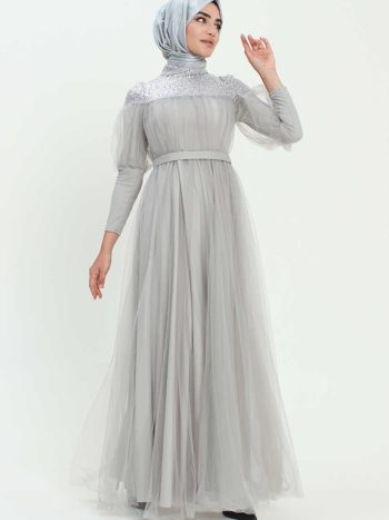 This evening dress with tulle and sequin details offers an elegant and stylish design, perfect for your special occasions. The
