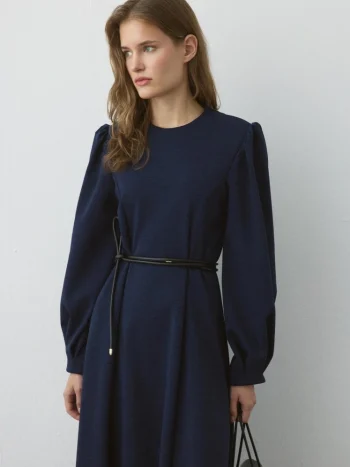 PREMİUM BELDEN OTURMA DETAYLI LACİVERT ELBİSE ÖZELLİKLERİ Bisiklet yakalı, vatkalı, arkadan fermuarlı, omuzdan büzgülü ve kol uçları pili kaşe detaylı,