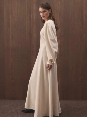 PREMIUM VANILLA DRESS WITH WAIST SEAM DETAIL FEATURES: Bateau neckline, padded, back zipper, shoulder gathers, and cuff pleat detail, self-fabric
