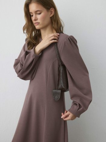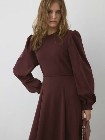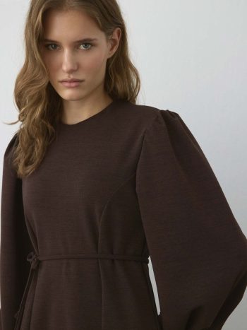 PREMIUM BROWN DRESS WITH WAIST SEAM DETAIL FEATURES: Bicycle collar, padded shoulders, back zipper, gathered at shoulders, pleated detail at