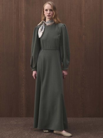 PREMIUM SAGE GREEN DRESS FEATURES: Bicycle collar, shoulder pads, back zipper, shoulder gathers, pleated cuff details, self-fabric tie belt, full