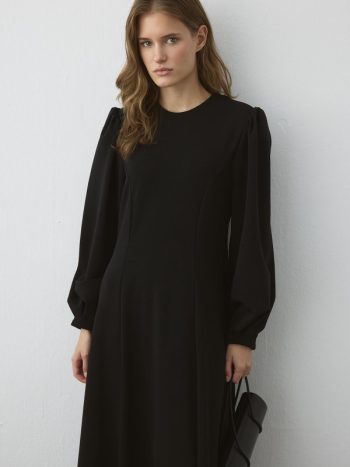 FEATURES OF THE PREMIUM BLACK DRESS WITH WAIST SEAM DETAIL: Bateau neckline, padded shoulders, back zipper, gathered shoulders, and cuffs