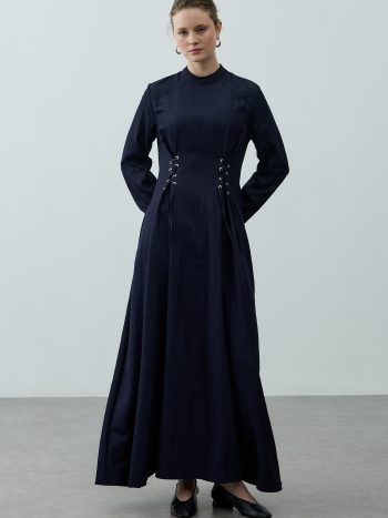 A textured woven fabric dress featuring a mandarin collar, back zipper closure, eyelet detailing at the waist, long sleeves with
