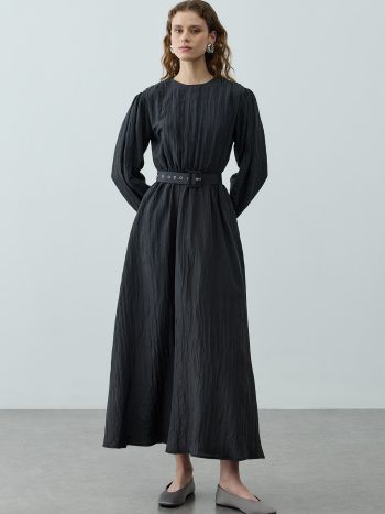 Black Pleated Belted Dress with Sheen