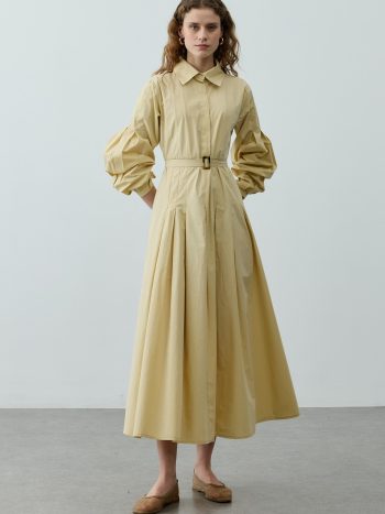 Made from 100% cotton woven fabric, featuring long sleeves with pleated gathers, a shirt collar, a delicate belt detail, a