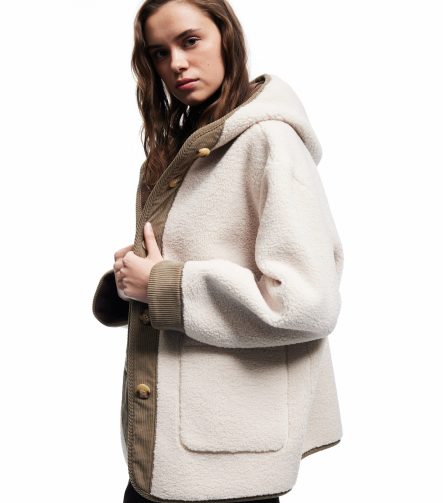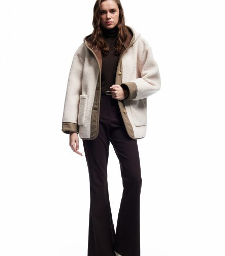 Long-Sleeve Hooded Plush Coat with Suede Lining, Pockets and Buttons