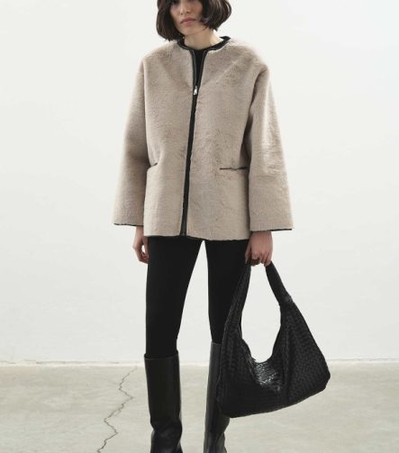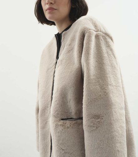 Contrast Leather Trimmed Faux Fur Beige Coat